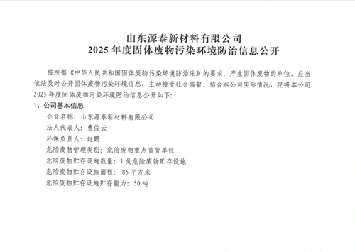 山东源泰新材料有限公司2025年度固体废物污染环境防治信息公开
